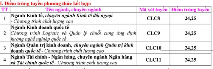 Các chương trình đào tạo xét tuyển theo phương thức này được giảng dạy bằng tiếng Anh, gồm chương trình chất lượng cao Kinh tế đối ngoại, Quản trị kinh doanh quốc tế, Logistics và quản lý chuỗi cung ứng, Ngân hàng và tài chính quốc tế.