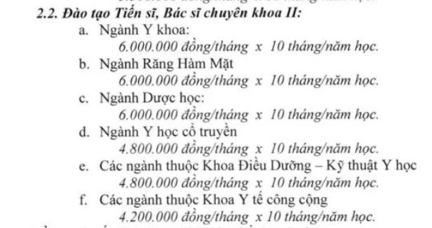 Ở bậc đào tạo tiến sĩ, Bác sĩ chuyên khoa II, học phí cao nhất là 60 triệu đồng/năm học áp dụng cho ba ngành là Y khoa, Răng hàm mặt và Dược học. Các ngành còn lại từ 42-48 triệu đồng/năm học.