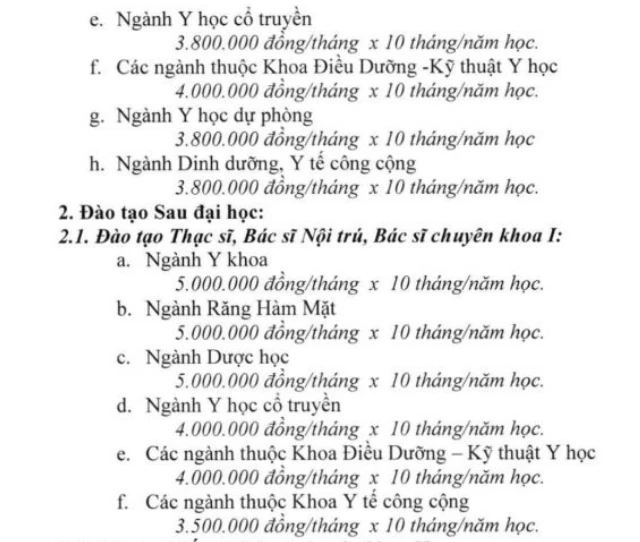 Như mức học phí thấp nhất là ngành Y tế công cộng và Dinh dưỡng là 38 triệu đồng/năm học chứ không phải là 30 triệu đồng như trước đó.