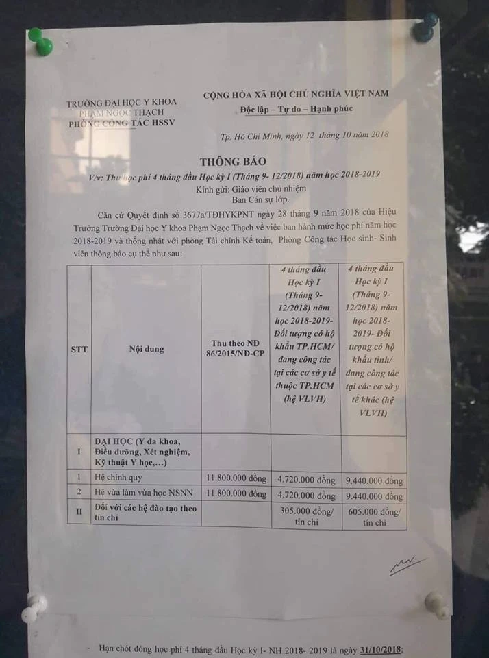Học phí bốn tháng đầu năm học 2018-2019 của Trường ĐH Y khoa Phạm Ngọc Thạch. Ảnh: Cộng đồng sinh viên Trường ĐH Y khoa Phạm Ngọc Thạch