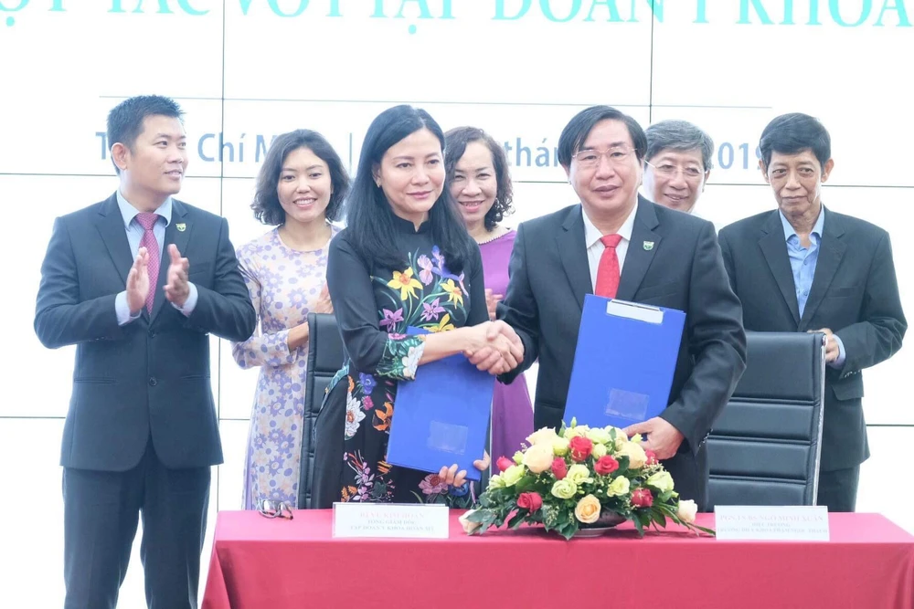 Đại diện ĐH Y khoa Phạm Ngọc Thạch ký kết hợp tác đào tạo với đại diện Tập đoàn Y khoa Hoàn Mỹ. Ảnh: HL
