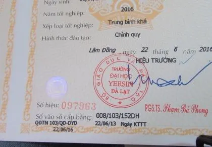 Thông tin in sai trên bằng tốt nghiệp Trường ĐH Yersin Đà Lạt cấp cho sinh viên.