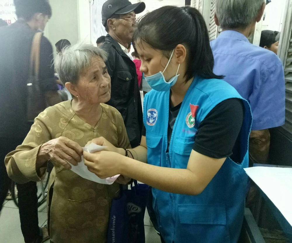Các tình nguyện viên tận tình hướng dẫn người bệnh. Ảnh: TRÚC PHƯƠNG.