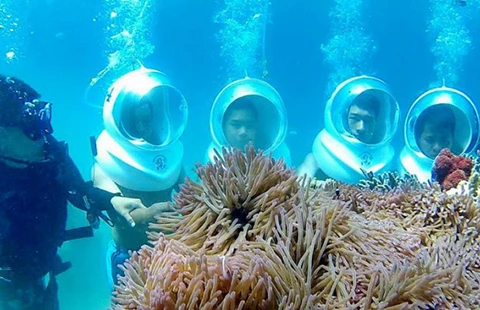 Tham gia tour các du khách không cần biết bơi hay biết lặn mà sẽ chỉ đội một chiếc mũ có dưỡng khí do Công ty Sea - Trek của Mỹ sản xuất. Với chiếc mũ này, du khách sẽ được hướng dẫn viên đưa xuống đáy biển có độ sâu 5-6 m, sau đó đi bộ khoảng 300 m trong vòng 15-20 phút dưới đáy biển trong một lộ trình định sẵn được bảo vệ bằng dây căng để xem san hô và đời sống tôm cá. Du khách cũng có thể cho cá biển ăn bởi các hướng dẫn viên của tour trước đó đã nhiều lần xuống biển tập cho cá ăn, dụ cá trong rạn san hô quen với sự xuất hiện cho ăn của người.