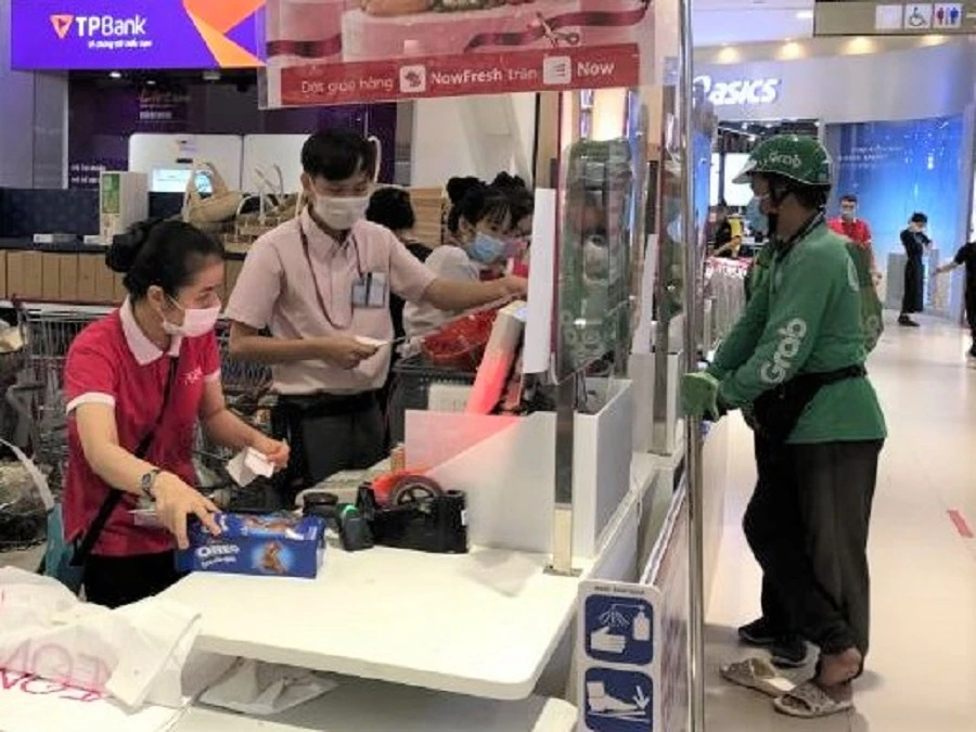 Nhân viên Grab đợi nhận hàng ở một siêu thị