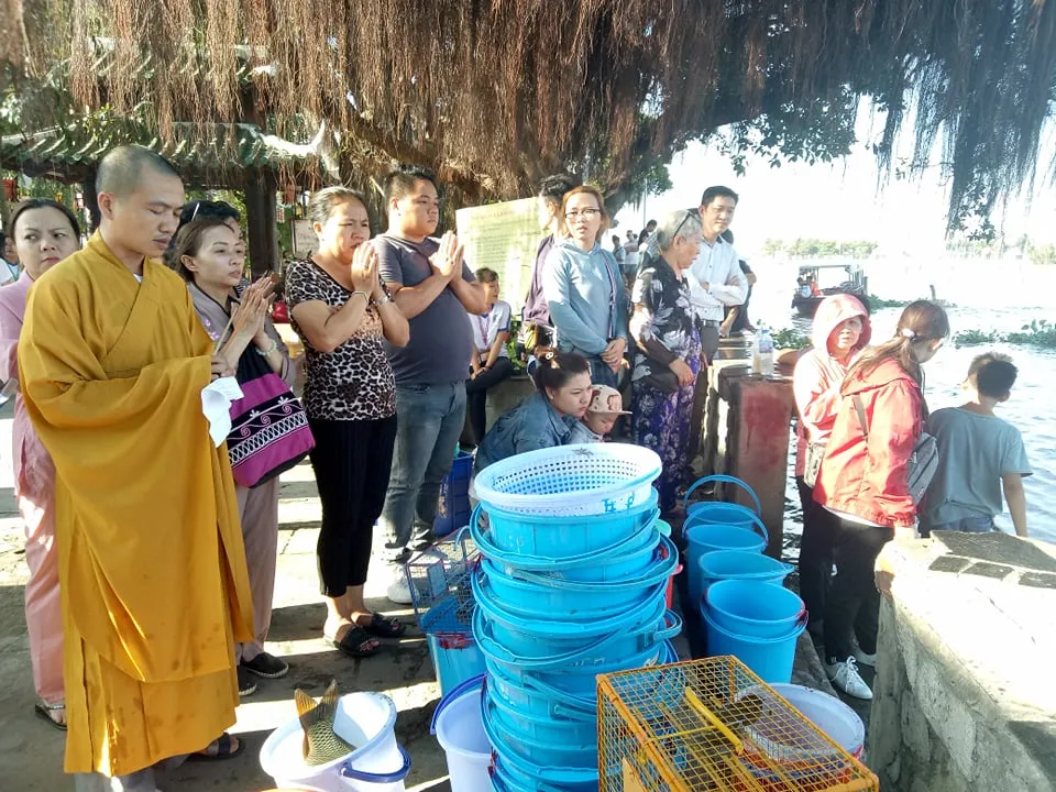 Gần đó, một phụ nữ tên Cẩm đang hướng dẫn một cô gái về cách phóng sinh. "Nếu muốn phóng sinh thì con phải thả cá từ từ, phải đọc kinh từ 7 đến 21 lần trước khi thả. Cứ khi nào dư giả là con mua cá, chim để thả thì tốt lắm. Nghiệp của con sẽ từ từ tiêu tán, gia đạo sẽ hạnh phúc, làm ăn học hành phát đạt. Nói chung là tốt đủ mọi đường".