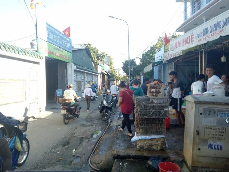 Cảnh mua bán chim, cá để phóng sinh tấp nập trước chùa Diệu Pháp. Ảnh: TRÚC PHƯƠNG.
