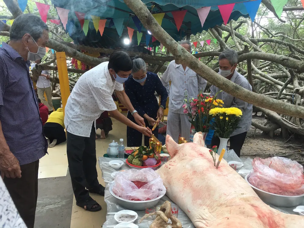 Người dân thường dâng heo lên cúng, rồi xẻ thịt cho mọi người cùng ăn. Ảnh: HẢI DƯƠNG