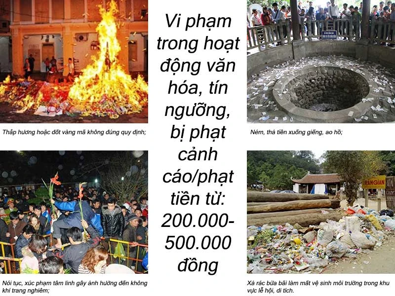 Quy định xử phạt vi phạm hành chính trong lĩnh vực văn hóa, thể thao, du lịch và quảng cáo đã kịp thời bổ sung quy định xử phạt đối với nhiều hành vi vi phạm trong hoạt động văn hóa, tín ngưỡng như ném tiền, đốt vàng mã… gây bức xúc xã hội thời gian qua. Nghị định có hiệu lực từ ngày 5-5.