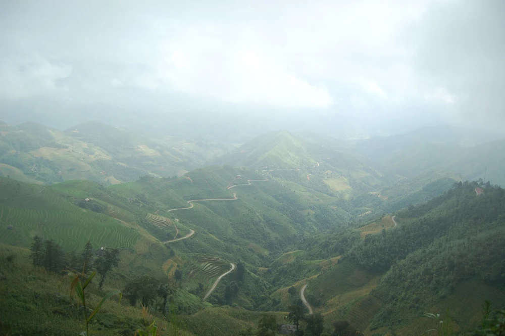 Nhìn từ trên cao, đèo Mã Pí Lèng như một con rắn khổng lồ ngoằn ngoèo bò quanh sườn núi. Ảnh: Đoàn Quý
