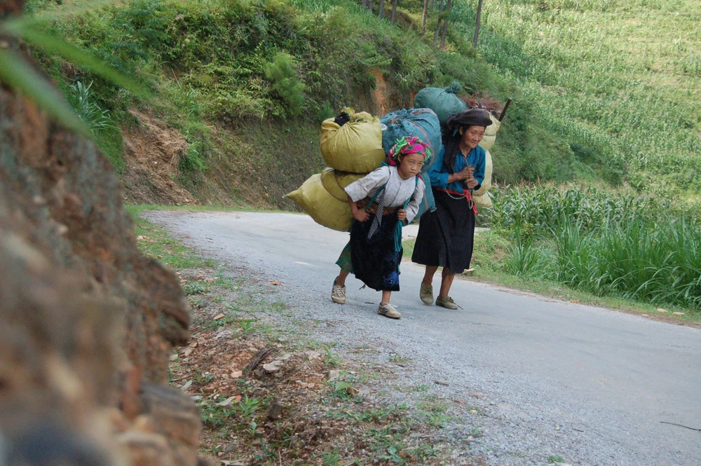 Một cảnh bà cháu gùi đồ cồng kềnh trên con đường ngoằn ngoèo ở miền núi. Ảnh: Đoàn Quý