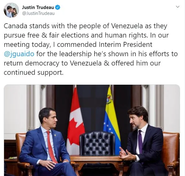 Điểm đến tiếp theo trong hành trình “vòng quanh thế giới” là Canada. Tại Ottawa, ông Guaido đã diện kiến Thủ tướng Justin Trudeau, người luôn khẳng định ủng hộ ông nắm quyền lực tại quê nhà.