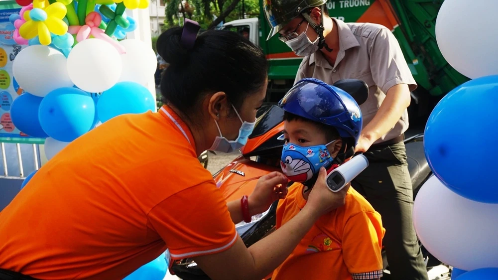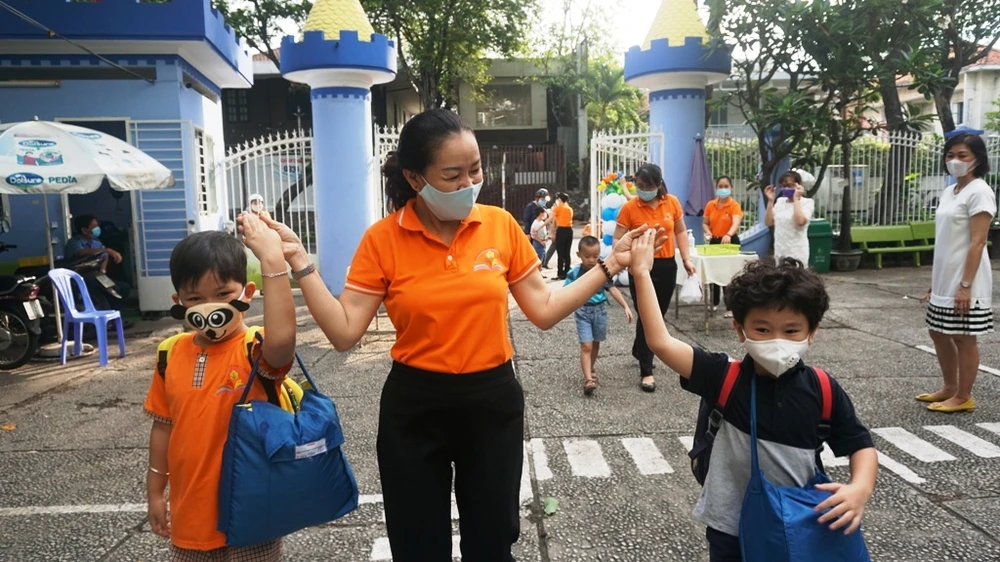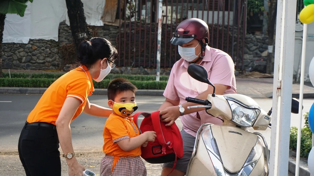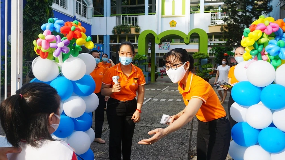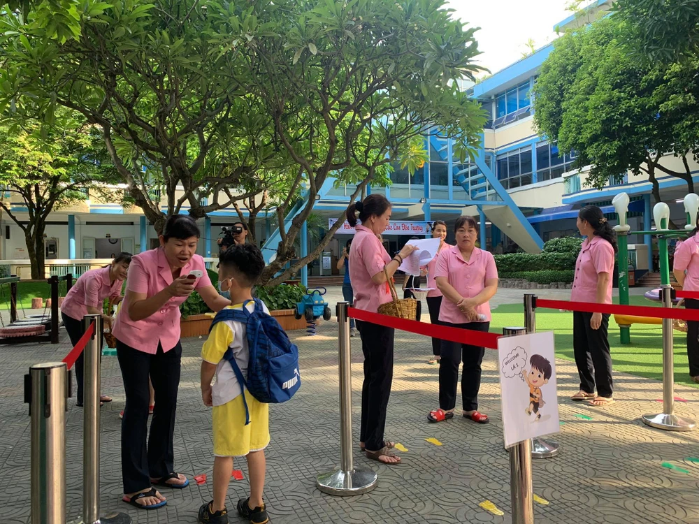 Các giáo viên trường mầm non 19-5 thành phố, quận 1, đón các bé lớp lá vào trường, thực hiện việc đo thân nhiệt và điểm danh.
