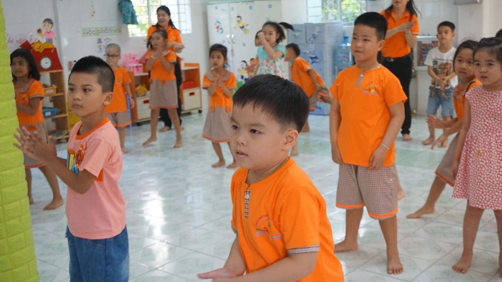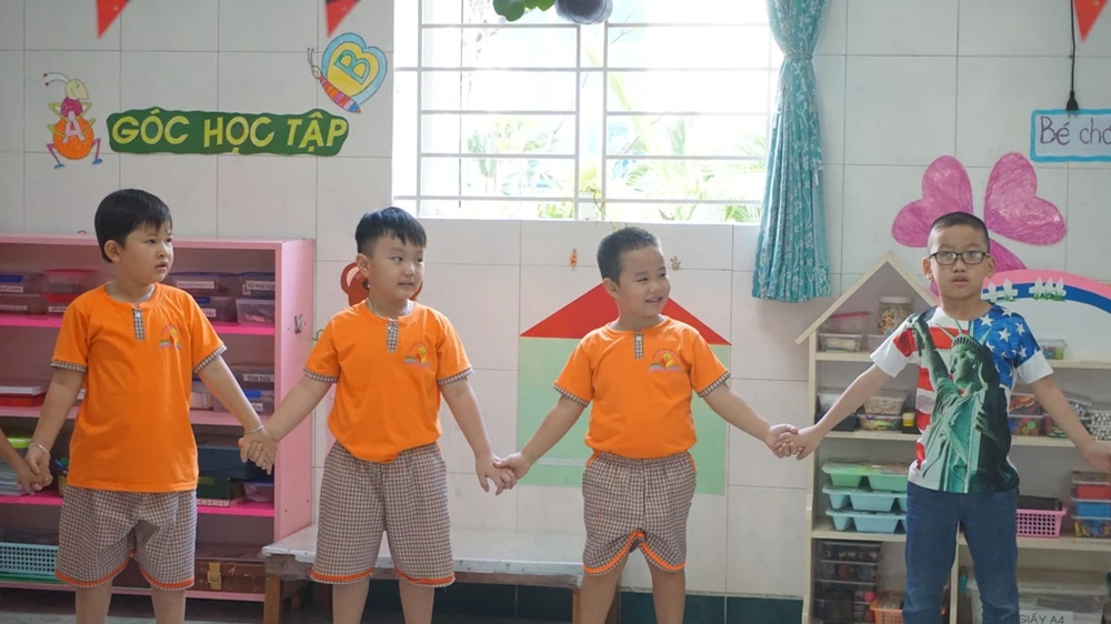 Các bé trường mầm non Hoa Phượng Đỏ, quận Gò Vấp hớn hở chơi trò chơi ngay trong ngày đầu trở lại "hội nhập" với bạn bè.