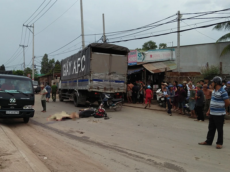 Tại hiện trường, thi thể người đàn ông nằm cạnh xe máy, gần đó là chiếc xe tải, rất đông người dân theo dõi vụ việc.