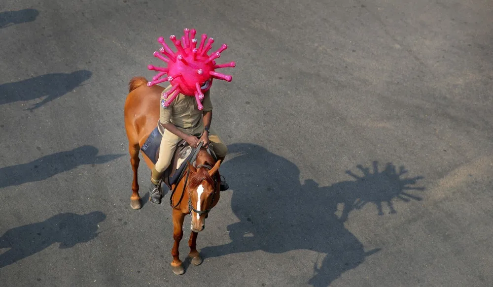 Cảnh sát Ấn Độ đội mũ bảo hiểm có hình dạng mô phỏng con virus Corona đi ngựa diễu hành nhằm nâng cao nhận thức của người dân về tính nguy hiểm của đại dịch COVID-19 và sự cần thiết phải chung tay ngăn chặn dịch tại TP Hyderabad, bang Telangana (miền Nam Ấn Độ) ngày 2-4. Ảnh: AP