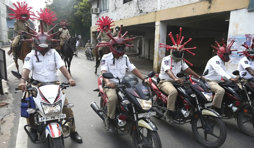 Cảnh sát Ấn Độ đội mũ bảo hiểm có hình dạng mô phỏng con virus Corona nhằm nâng cao nhận thức của người dân về tính nguy hiểm của đại dịch COVID-19 và sự cần thiết phải chung tay ngăn chặn dịch tại TP Hyderabad, bang Telangana (miền Nam Ấn Độ) ngày 2-4. Ảnh: AP