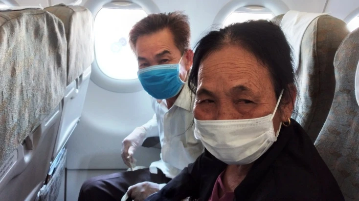 Hai vợ chồng quê huyện Thanh Chương (Nghệ An) đi đám cưới con ở miền Nam trở về. Đi máy bay ông bà đều đeo khẩu trang và găng tay, hạn chế nói chuyện với nhau.