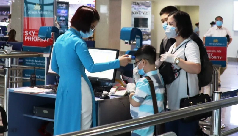 Tại sân bay Tân Sơn Nhất, trước khi lên máy bay hành khách trẻ em và người lớn đều được hướng dẫn kê khai y tế và do nhiệt độ.