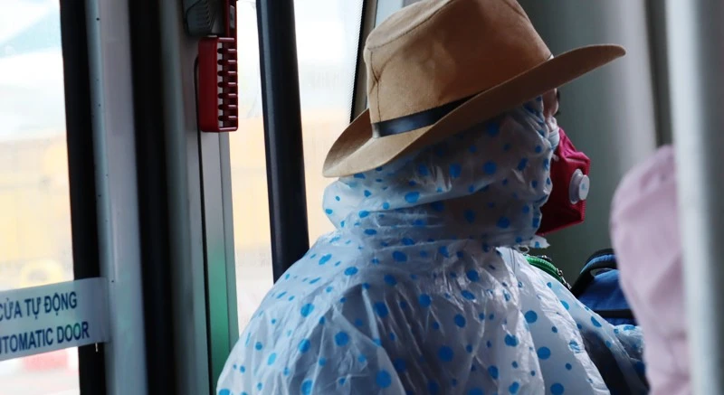 Người đàn ông đội mũ, mặc áo mưa trùm kín mặt ở sân bay Tân Sơn Nhất.