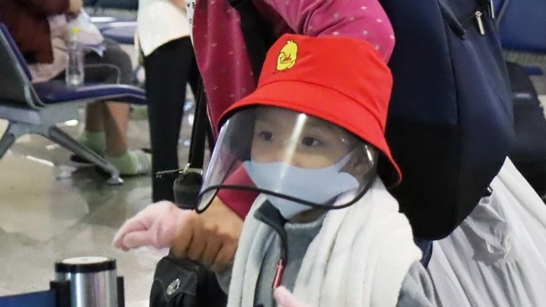 Trẻ em được mẹ mua mũ có tấm che giọt bắn để đi máy bay.