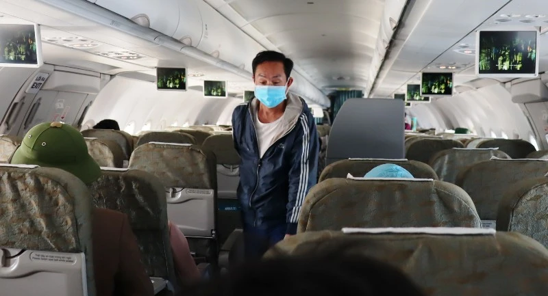 Trên chuyến bay của hãng hàng không Việt Nam Airlines từ Tân Sơn Nhất về sân bay Vinh chiều 24-3, hầu hết hành khách ngồi yên, hạn chế cả đi vệ sinh trên máy bay.