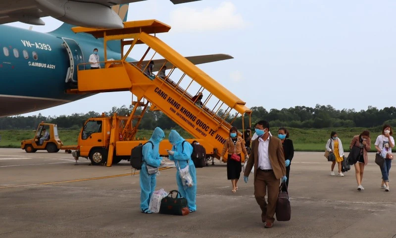 Tại Nghệ An chiều 24-3, chưa có ca nào dương tính với dịch COVID-19. Dù thời tiết nắng nóng nhưng hành khách xuống sân bay Vinh (Nghệ An) vẫn cẩn thận mang đồ bảo vệ kháng khuẩn.