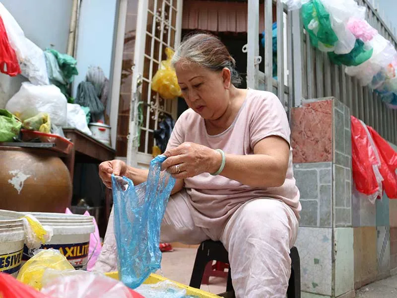 Giờ đây đã 62 tuổi, không chỉ dừng lại ở nghề phơi cơm, dì còn đi nhặt bao nylon ở chợ về, chiều nào cũng ngồi giặt sạch rồi mang đi phơi, cột lại từng bó rồi đi bán lại. Dì nhặt bao nylon về vì thấy họ xả rác ra ngoài đường, ảnh hưởng tới môi trường xung quanh...