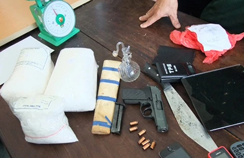 Tang vật thu giữ tại chỗ gồm 3,8 kg ma túy đá, một khẩu súng quân dụng K54 cùng đạn, một chiếc dao mẹo, hai cân tiểu ly, một bộ dụng cụ sử dụng ma túy đá, ba điện thoại iPhone, Nokia, một ô tô năm chỗ hiệu Nissan.