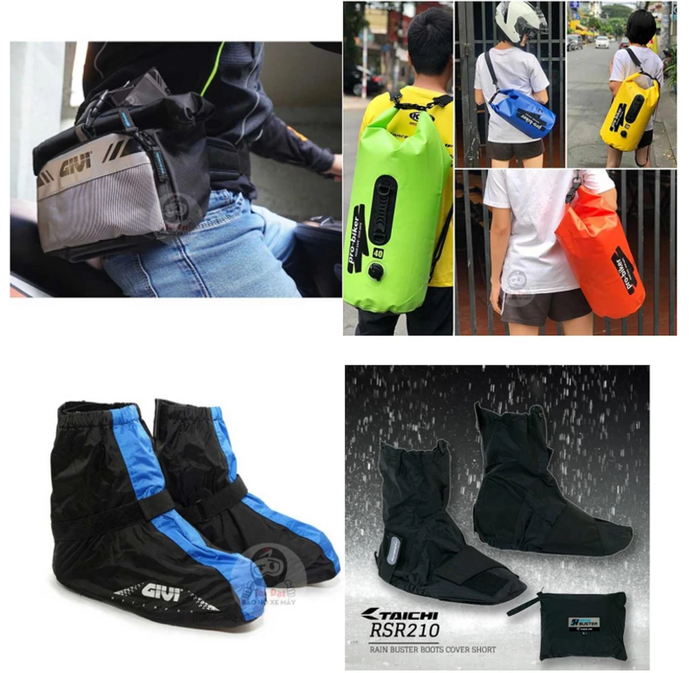 Để giày không bị ướt làm đôi chân ướt lạnh, ủng đi mưa, bọc giày chống nước cũng khá hữu ích. Phụ kiện này có khả năng chống nước hoàn hảo, giúp chân không bị ướt mưa và đặc biệt giúp tránh được cảm giác khó chịu khi giày bị nước chảy vào trong. Bọc giày Givi SC02 và Taichi RSR210 đều đáp ứng tốt nhu cầu của người dùng.