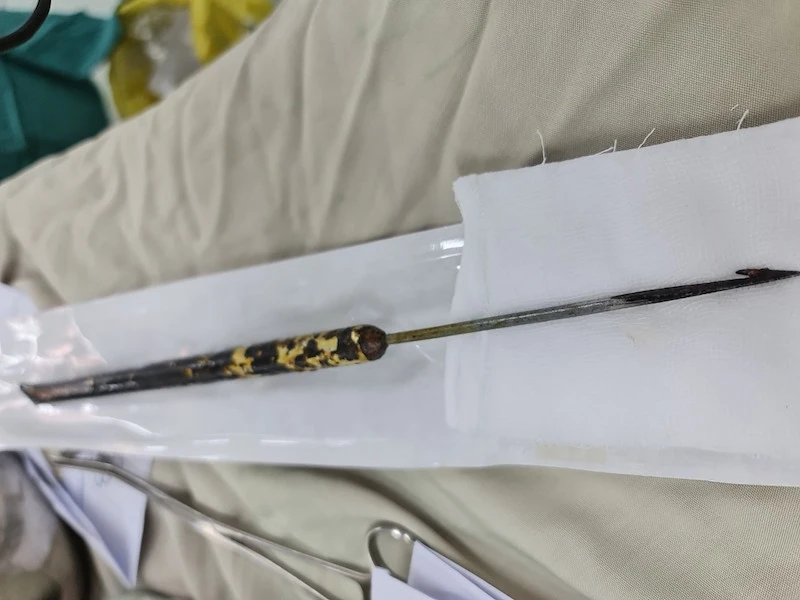 Bệnh nhân là anh NVC (31 tuổi, ngụ huyện Cờ Đỏ, TP Cần Thơ) nhập viện trong tình trạng bị vật nhọn đâm thủng ngực phải, dị vật bộc lộ bên ngoài dài khoảng 20 cm.