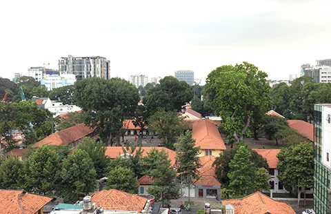 Trường Marie Curie nhìn từ trên cao, cổ kính dưới bóng mát cổ thụ. Ảnh: QUỲNH NHƯ