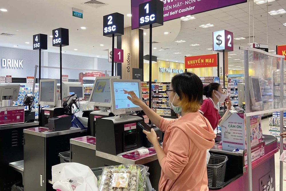 Tương tự, siêu thị AEON Tân Phú cũng triển khai máy thanh toán tự động ứng dụng công nghệ để gia tăng tiện ích cho khách hàng. Theo đó, máy chọn món tự động hoạt động tựa như một chiếc smartphone cỡ lớn, giúp thực khách dễ dàng chọn món mà mình yêu thích. Người tiêu dùng có thể chọn phương thức thanh toán bằng thẻ ngân hàng hoặc ví điện tử trên máy thanh toán tự động và tiến hành thanh toán.