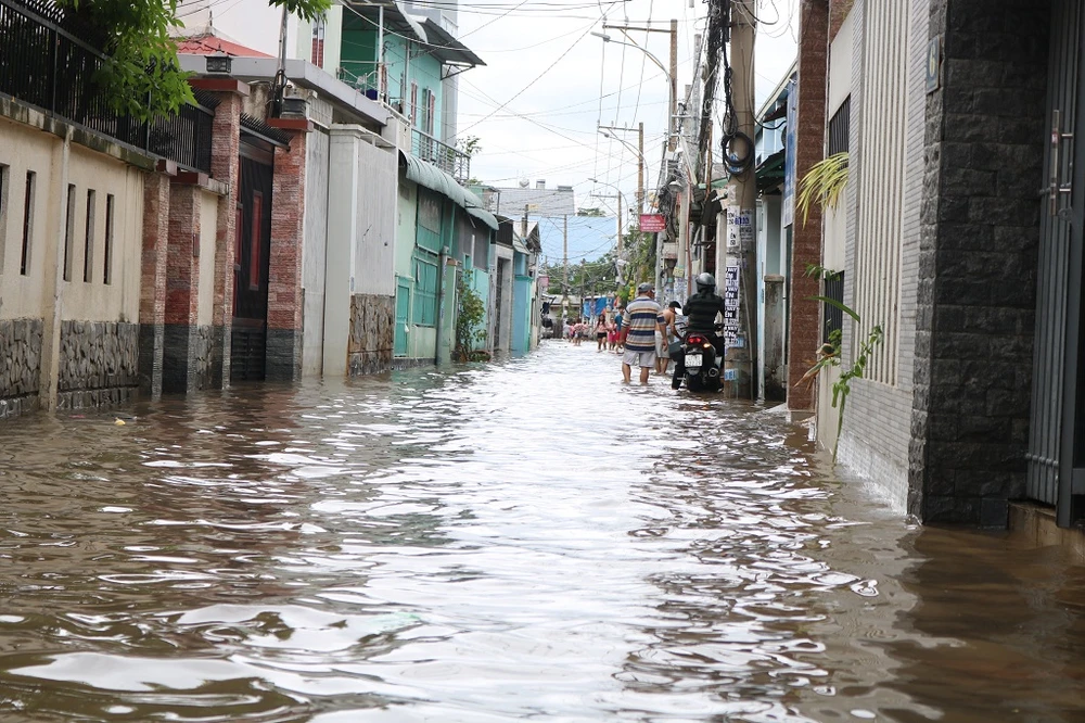 Đến sáng nay (27-11), nhiều người dân ở khu phố 5, phường Hiệp Bình Phước, quận Thủ Đức, TP.HCM vẫn sống trong cảnh nước ngập sau khi cơn bão số 9 đi qua.