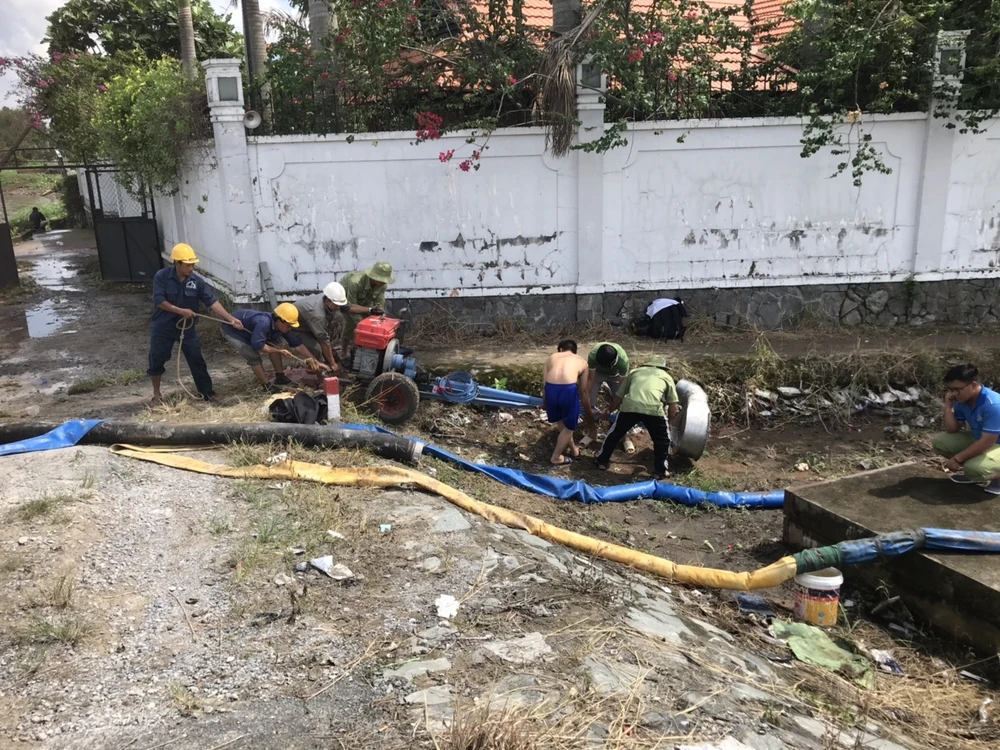 “Hiện chúng tôi bố trí bốn máy bơm ở cống ngăn triều cầu Đúc Nhỏ để bơm nước ở hẻm 606 và khu dân cư Văn Lang, bốn máy khác ở cống ngăn triều cầu Bà Giao để bơm nước ở đường số 7, đường số 9 và hai máy ở quốc lộ 13 cũ (thuộc khu phố 3) để giải quyết tình trạng ngập nước” - đại diện UBND phường thông tin.