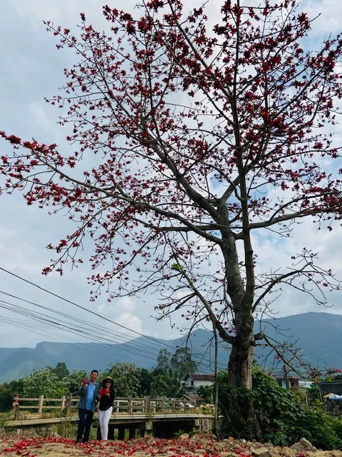 Cây bên cầu Hà Tân có màu đỏ thắm như không thể thắm hơn. Hoa đã rụng rất nhiều và búp thì vẫn còn đầy, rực rỡ bên đường đi. Hoa còn nở trong vài tuần nữa nên hy vọng khách vẫn còn cơ hội thưởng lãm.