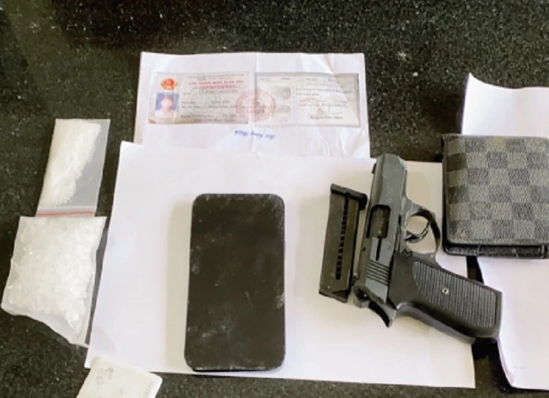 Kiểm tra hành chính người và giỏ xách của nghi can phát hiện có 2 bịch nylon chứa ma túy đá và một khẩu súng bắn đạn cao su không lắp đạn.