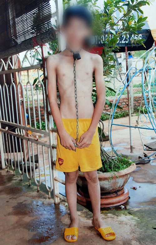 Trong tập ảnh mà người dân chụp lại những lần cháu N. bị ba hành hạ, có một tấm chúng tôi không dám nhìn lâu: cháu N. bị trói bằng một sợi dây xích, quấn từ trên cổ xuống. N. đứng trần trụi, xương sườn gầy guộc trơ ra, đôi mắt không còn chút cảm xúc. Ở những tấm ảnh khác là chi chít vết lằn do dây xích quật trên lưng, cổ của N..