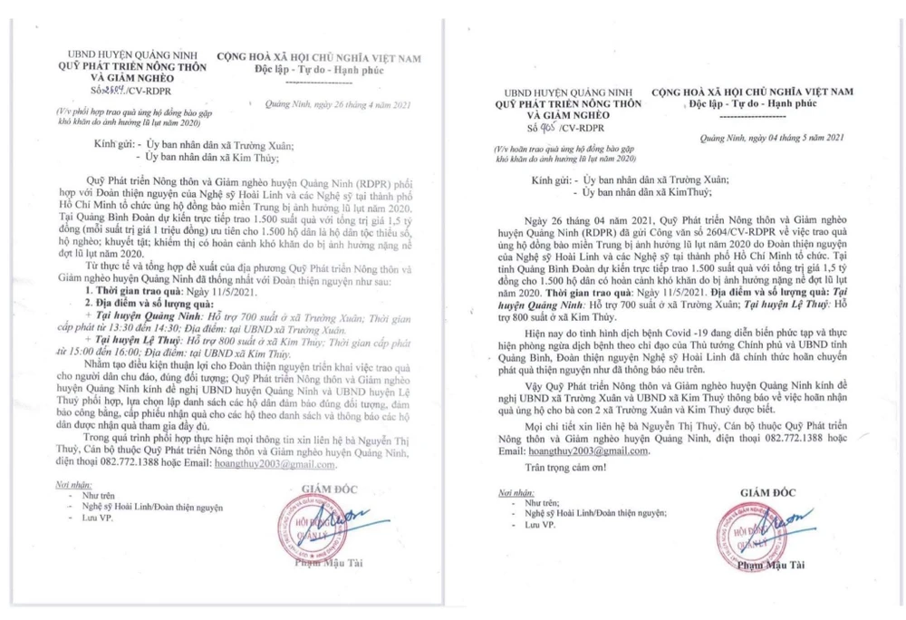 Theo đó, vào ngày 4-5-2021, Quỹ phát triển nông thôn và giảm nghèo của huyện Quảng Ninh đã có công văn gửi UBND xã Trường Xuân (huyện Quảng Ninh) và UBND xã Kim Thủy (huyện Lê Thủy) về việc hoãn trao quà ủng hộ đồng bào gặp khó khăn do ảnh hưởng lũ lụt năm 2021.