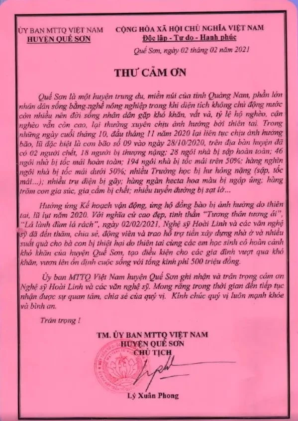 Ngày 25-5, ông Lý Xuân Phong, Chủ tịch Uỷ ban Mặt trận Tổ quốc Việt Nam huyện Quế Sơn (Quảng Nam) cho biết, cơ quan đã có thư cảm ơn gửi đoàn của NSƯT Hoài Linh.