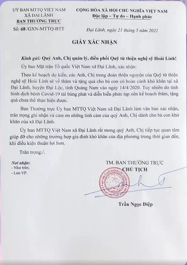 Cùng ngày, ông Trần Ngọc Điệp, Chủ tịch Uỷ ban Mặt trận Tổ quốc Việt Nam xã Đại Lãnh (huyện Đại Lộc, Quảng Nam) cũng xác nhận, đơn vị đã có giấy xác nhận gửi cho đoàn của NSƯT Hoài Linh.