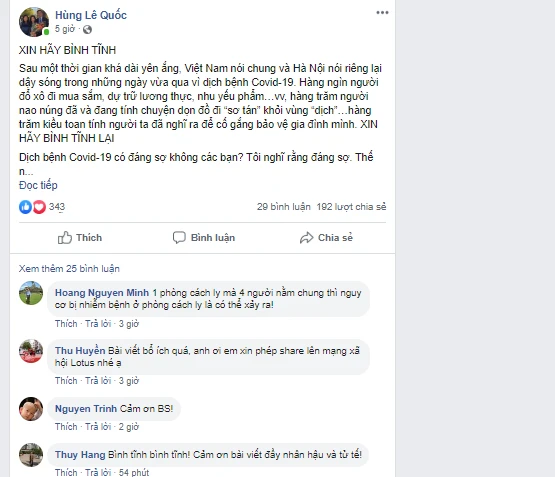 “Sau một thời gian khá dài yên ắng, Việt Nam nói chung và Hà Nội nói riêng lại dậy sóng trong những ngày vừa qua vì dịch bệnh COVID-19. Hàng ngìn người đổ xô đi mua sắm, dự trữ lương thực, nhu yếu phẩm, hàng trăm người nao núng đã và đang tính chuyện dọn đồ đi sơ tán khỏi các vùng dịch. Hàng trăm kiểu toan tính, người ta đã nghĩ ra để cố gắng bảo vệ gia đình mình. XIN HÃY BÌNH TĨNH LẠI.