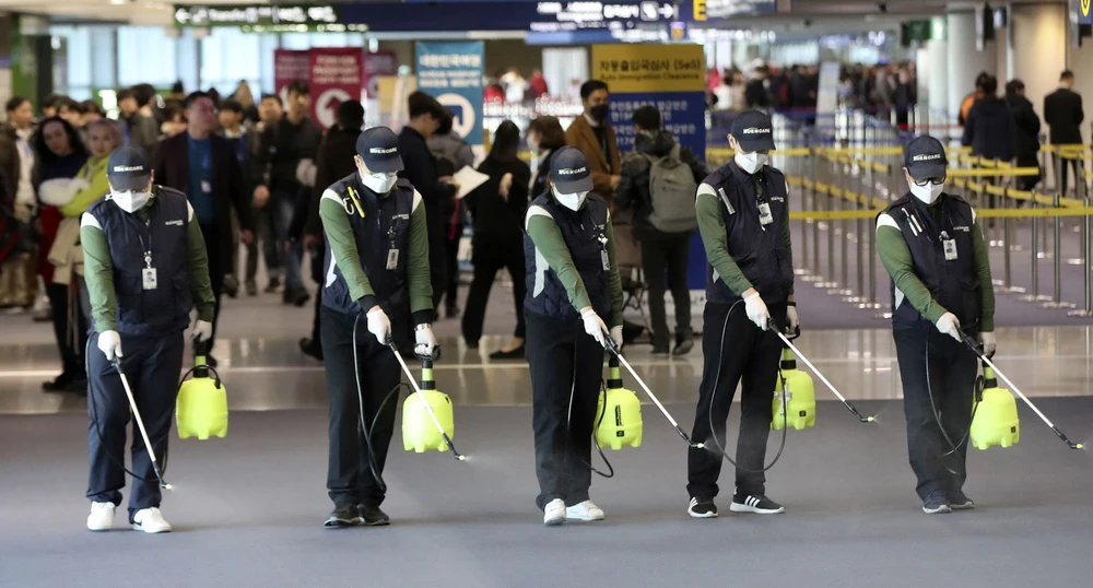 Nhân viên y tế ở sân bay quốc tế Incheon (Hàn Quốc) phun dung dịch khử trùng ở cổng đón khách. Ảnh: CNN