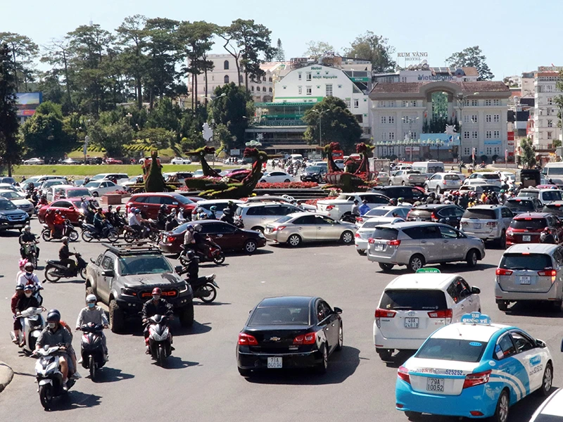 Khu vực đài phun nước trung tâm thành phố Đà Lạt rất đông xe qua lại trong dịp lễ 30-4. Ảnh: TTXVN