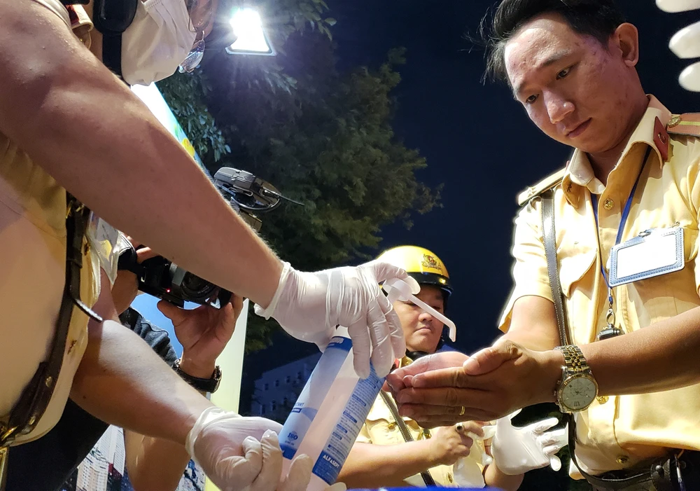 CSGT sát trùng tay cho người dân trước khi thực hiện các bước kiểm tra nồng độ cồn. Ảnh: TỰ SANG