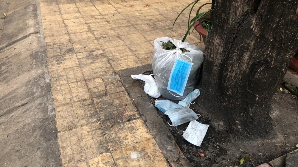 Nhiều người dùng xong khẩu trang thì vứt lung tung khắp nơi, đây là nguy cơ lây bệnh. Ảnh: NGUYỄN CHÂU