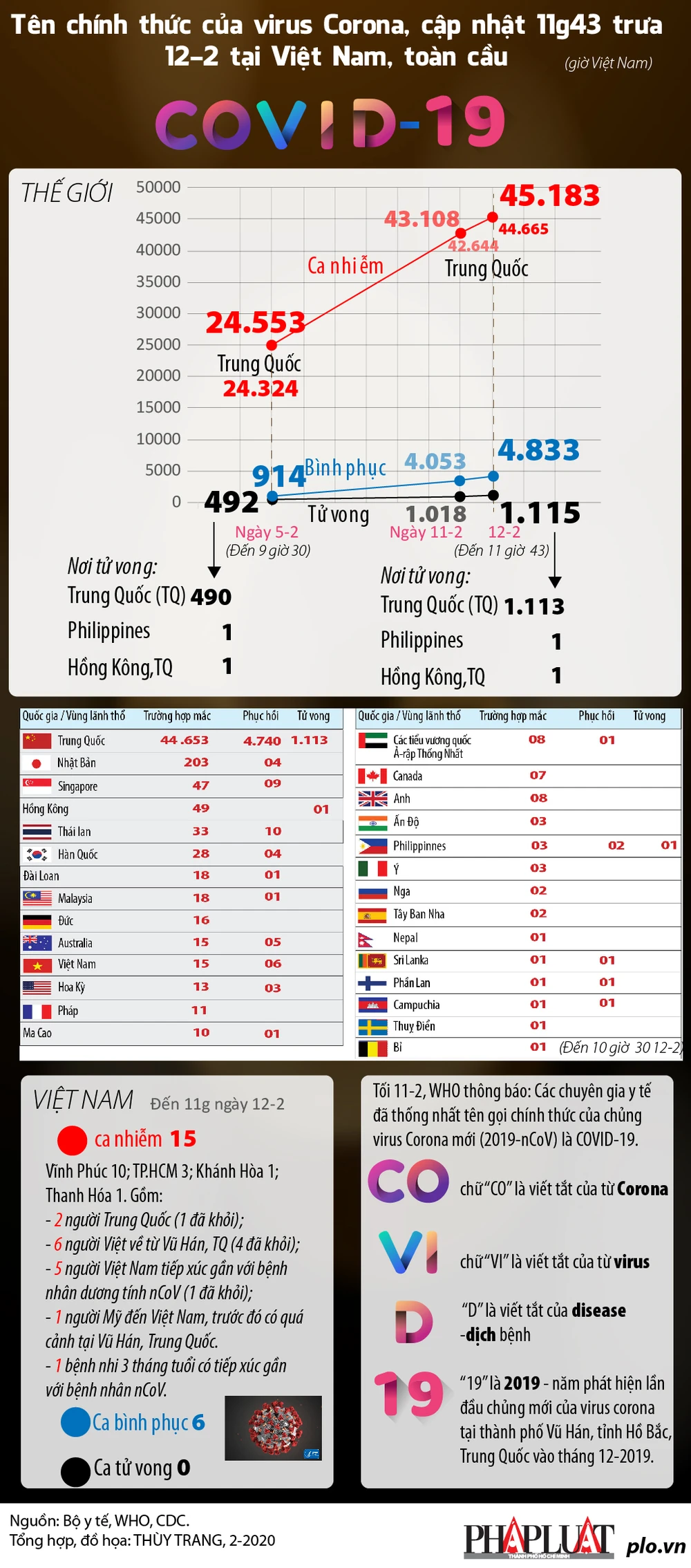 Toàn cảnh dịch Corona đến trưa 11-2 ở Việt Nam, toàn cầu (PLO)- Số ca bình phục tăng hơn gấp bốn lần, số ca nhiễm virus Corona 2019-nCoV toàn cầu và số ca tử vong tăng gần gấp đôi trong sáu ngày qua.