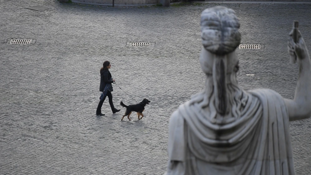 Một phụ nữ dắt chó đi dạo qua quảng trường Piazza del Popolo vắng du khách ở Ý. Ảnh: REUTERS