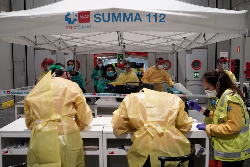 Nhân viên y tế chuẩn bị nhận các bệnh nhân nhiễm COVID-19 đầu tiên tại Trung tâm triển lãm Ifema ở Madrid, Tây Ban Nha. Ảnh: GETTY