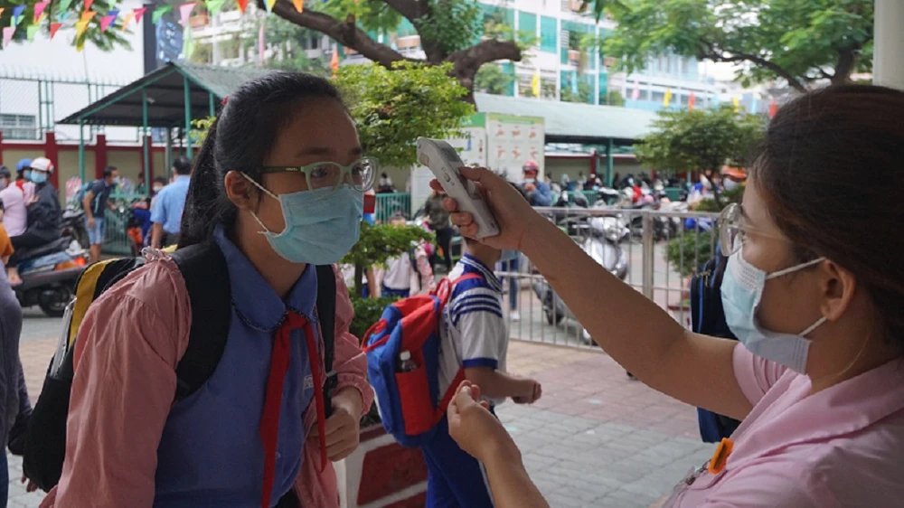 Học sinh trường Tiểu học Võ Văn Tần, quận 6 được đo thân nhiệt trước khi vào lớp. Ảnh: NGUYỄN QUYÊN